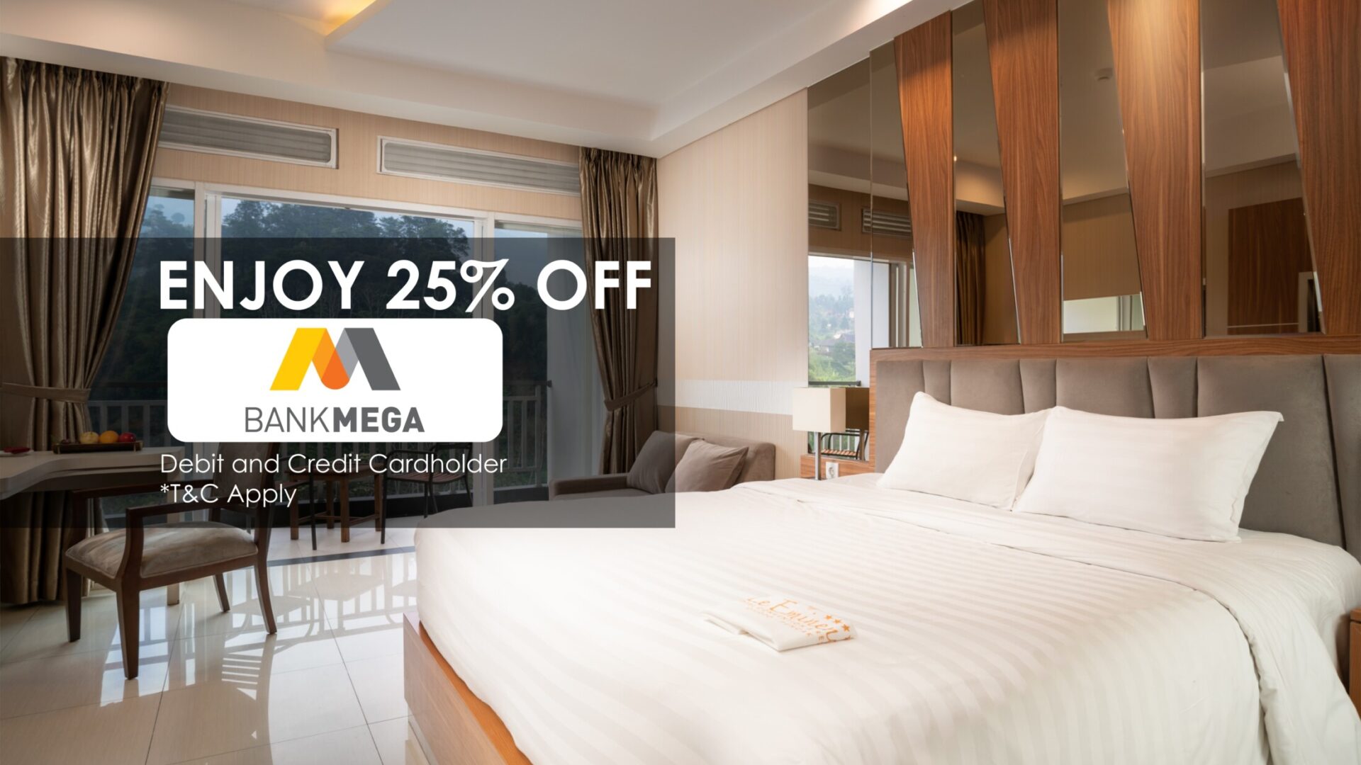 Enjoy a special 25% discount on your room booking when you pay using any valid Bank Mega Debit/Credit Card.